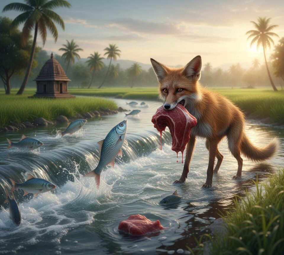 ஒரு நரி, அது பல நாள் பட்டினி. பல இடங்களிலே உணவுக்காக அலைந்தும் ஒன்றும் கிடைக்கவில்லை. கடைசியில் பெரியதொரு இறைச்சித்துண்டம் கிடைத்தது. அதை வாயிலே கௌவிக்கொண்டு நரி தன் இருப்பிடம் நோக்கி விரைந்தது. வழியிலே நீர் பாய்ந்து கொண்டிருக்கும் ஒரு வாய்க்கால். அதைக் கடந்து செல்லுகையில், மீன்கள் தண்ணீரில் குறுக்கும் நெடுக்குமாக ஓடி மிளிர்ந்தன. நல்ல வரிகளையுடைய வரால் மீன்கள் நீலநிறமாய்ப் பளபளவென்று மின்னின. தண்ணீர் வேகமாய்ச் சுருட்டி இழுத்தது. நரிக்கு நிலைக்க முடியாத ஆழம். ஆயினும் அது நீந்திக் கொண்டே சென்றது. வரால் மீன்கள் அதன் வாலிலும் காலிலும் பட்டு துடித்துத் துள்ளின. நீரை அடித்துத் தள்ளின. மீனைக் கண்டதும் நரிக்கு வாயிலே நீர் ஊறியது.